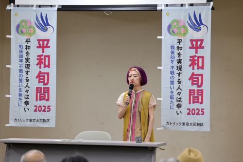 8月9日土曜日、午後1時から関口会館ケルンホールにて、同志社大学名誉教授、エコノミストで東京教区信徒の浜矩子さんの講演会が行われました。テーマは「戦後80年キリスト者としての平和への新たな決意」で、約250人が参加しました。講演の中で浜さんは、①より良く将来を見通すためにはより深く過去を振り返ることが必要。そして振り返った過去を忘れないように、無理やりにでも後世に引継いでいかなければならない。②本当の経済活動は人々の幸せのために行われるものであり、また人権の礎となるものでなければならない。③ヨハネの福音書にあるように、光は闇に打ち勝つ存在である。私たちキリスト者は光チームとして、世の闇に対して打ち勝つよう突き進んでいきましょうと話されました。また、高齢化社会というものは、見方によるとそれだけ成熟した人が多い社会と言えるのではないかともコメントされました。