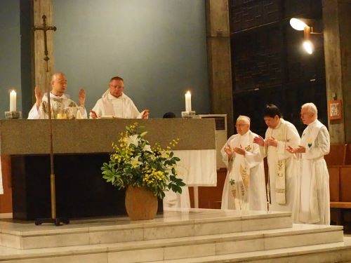 司式の佐藤神父(左)、イエジ・ヴィドムスキ神父(左2人目、渋谷教会助任司祭)と、各教会から集まった司祭団