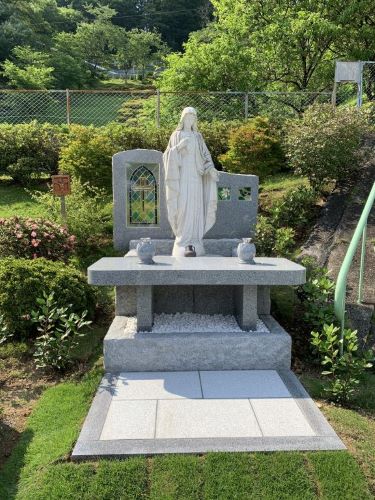 このたび五日市霊園2区のマリア像前に、新しく「祈りの場」を開設いたしました。 ステンドグラスをあしらった装飾のある明るいスペースです。