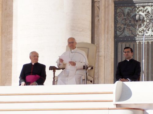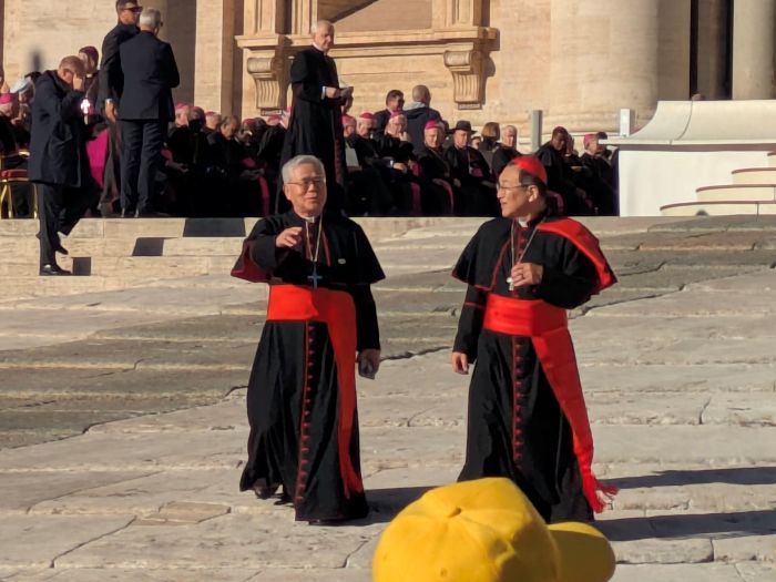 教皇一般謁見にて、日本からの巡礼団に近づく前田枢機卿と菊地枢機卿