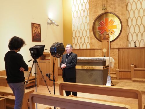 対談の後は、菊地枢機卿司式、アンドレア司教、小西神父、小田武直神父(教区本部事務局次長、生涯養成委員会担当司祭)共同司式による祝賀ミサが行われた。ミサの説教で菊地枢機卿は神学生時代の説教学の授業で、先生(日本基督教団の牧師)が、「聖書をパッと開いてさっと開いてそこを説教できなきゃダメだよ」と言っていた思い出に触れながら、その真意は聖書の知識が頭の中に入っていなければならないということではなく、「聖書を開いた瞬間、そのみことばを通じて、神が今自分に何を語りかけているのかに耳を傾け、それを言葉にして説教するんだ」という教えだったことを述べ、イエスの教えを伝えることの本質とは何かを語った。