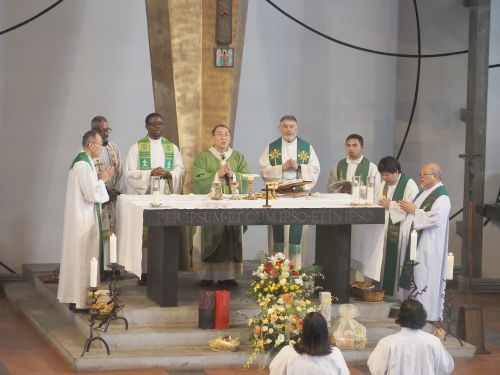 9月21日、目黒教会にて菊地功枢機卿司式による国際ミサが行われた。目黒教会は常に多国籍の信徒が集まる小教区であり、毎週、日本語の他、英語、インドネシア語、タガログ語でミサが行われているが、この日は普段の主日以上に大勢の、そして多国籍の信徒で聖堂はいっぱいになった。共同司式も主任司祭のアントニオ・カマチョ神父(メキシコ出身)、マーティン・デュマス神父(ガーナ出身)、協力司祭のエドウィン・コロス神父(フィリピン出身)の他、多国籍の司祭団によって行われた。