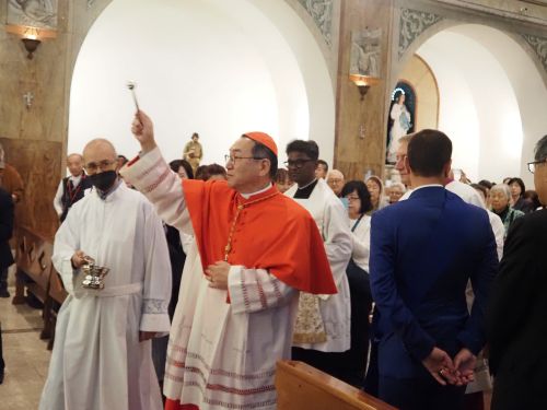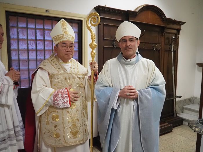 着座式と記念ミサには、日本からは菊地枢機卿とアンドレア・レンボ補佐司教の他、前田万葉枢機卿(大阪高松教区)、中村倫明大司教(長崎教区)、中野裕明司教(鹿児島教区)、そしてレオナルディ教会の司牧を担当する「神の母司祭修道会」出身のダビデ・カルボナーロ大司教(イタリア、ポテンツァ‒ムーロ・ルカーノ‒マルシコ・ヌオーヴォ教区)が出席。また、日本やローマからも多数の司祭が駆けつけ、6人の司教、約25人の司祭による式となった。さらに地元の信徒の他、この着座式に合わせて日本から複数の巡礼団が組まれ、ローマ在住の方々と合わせて100人を越える日本人信徒が集まった。